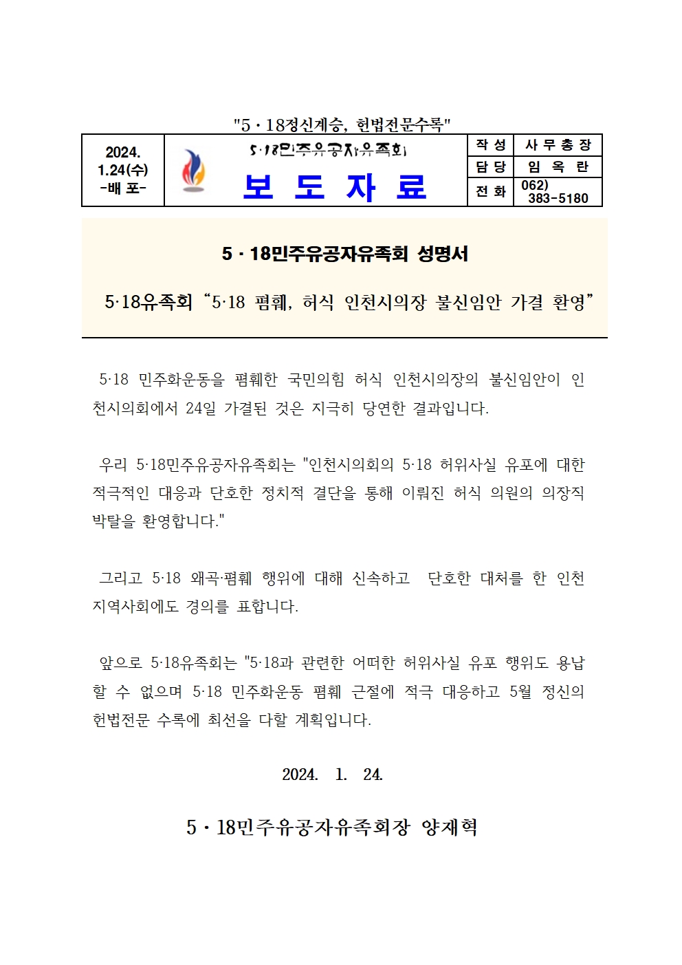 5·18민주유공자유족회장 2024년 2월 인사말