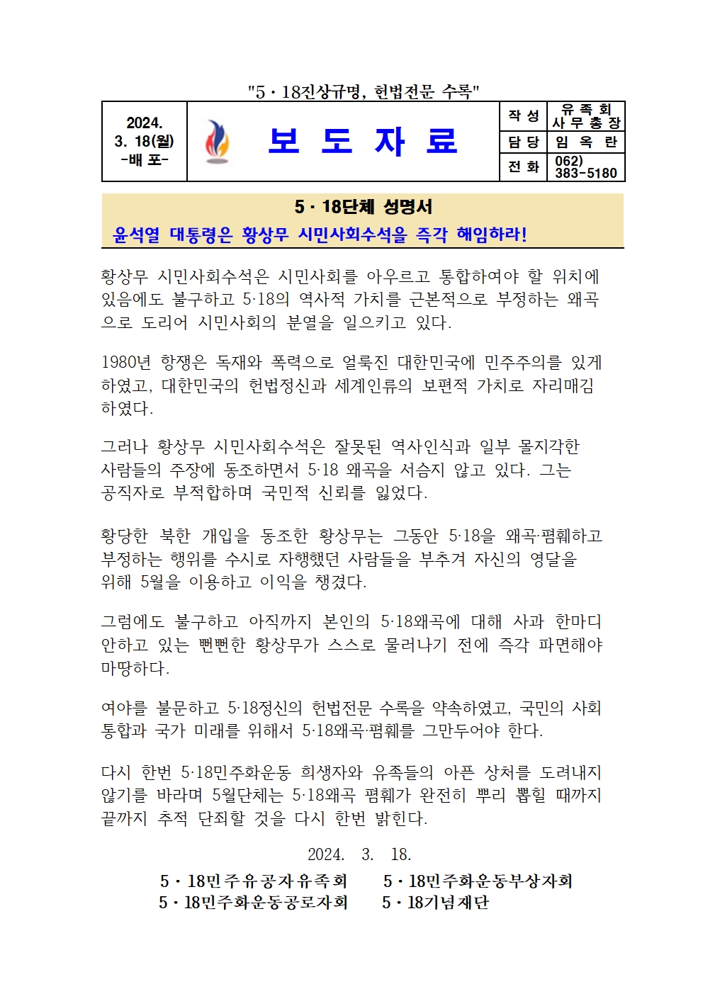 윤석열 대통령은 황상무 시민사회수석을 즉각 해임하라! - 5·18 4단체 성명서