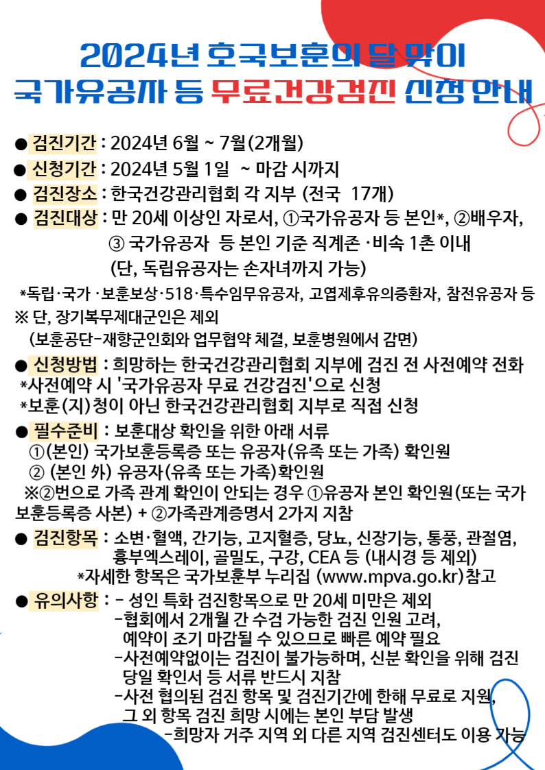 ※ 6월 호국보훈의 달을 맞아 한국건강관리협회가 사회공헌 사업으로 실시하는 무료건강검진을 안내하여 드립니다. 자세한 사항은 포스터를 참고하여 주시고 지참 서류및 일정에 차질이 없으시길 바랍니다.
