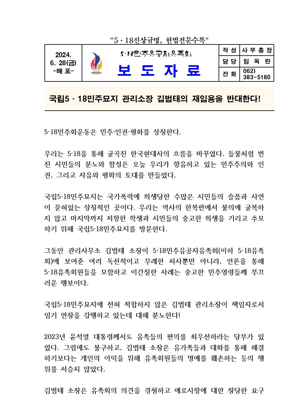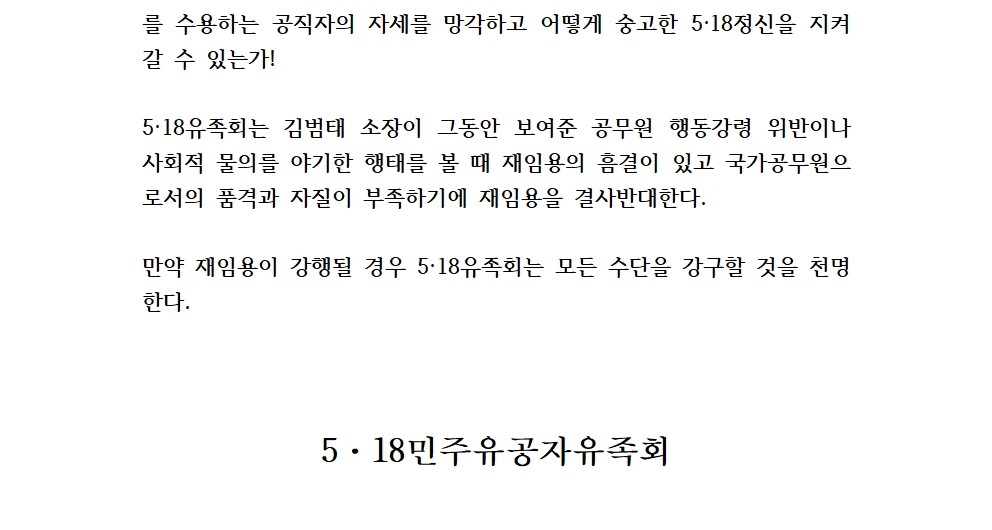 국립5·18민주묘지 관리소장 김범태의 재임용을 반대한다!
