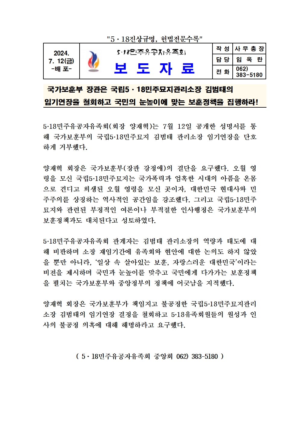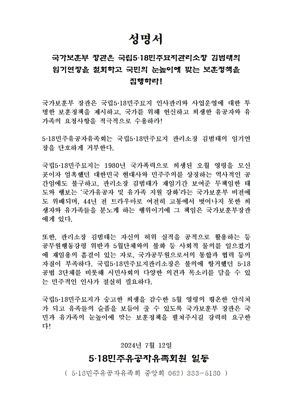성명서(국가보훈부 장관은 국립5·18민주묘지관리소장 김범태의 임기연장을 철회하고 국민의 눈높이에 맞는 보훈정책을 집행하라!)