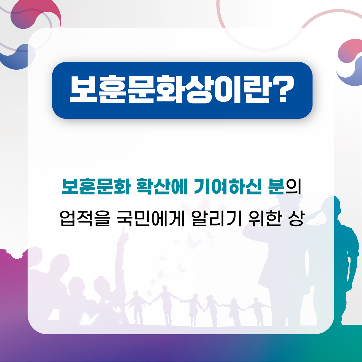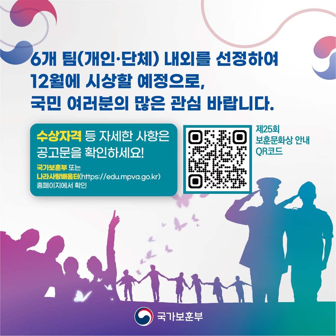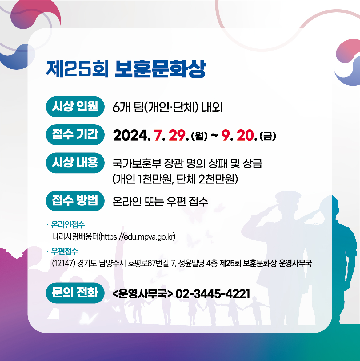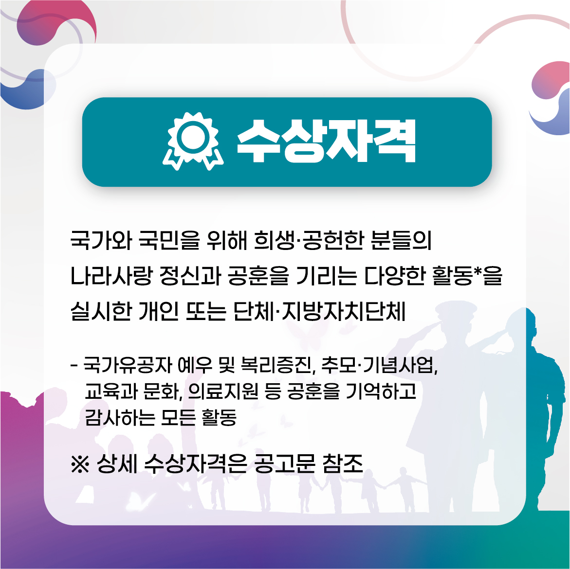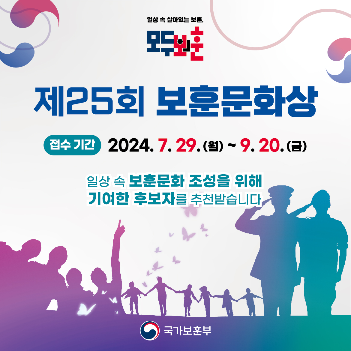 2024년도 보훈문화상 후보자 추천에 관한 안내를 드리니 일상 속 보훈문화 조성을 위해 기여한 5·18 유족회원 및 시민분들의 많은 추천과 신청 바랍니다.