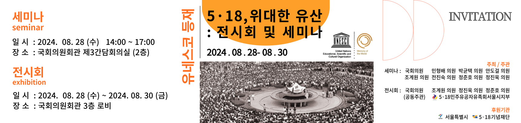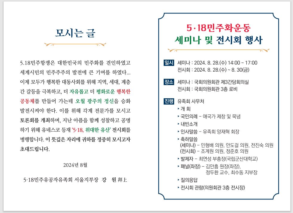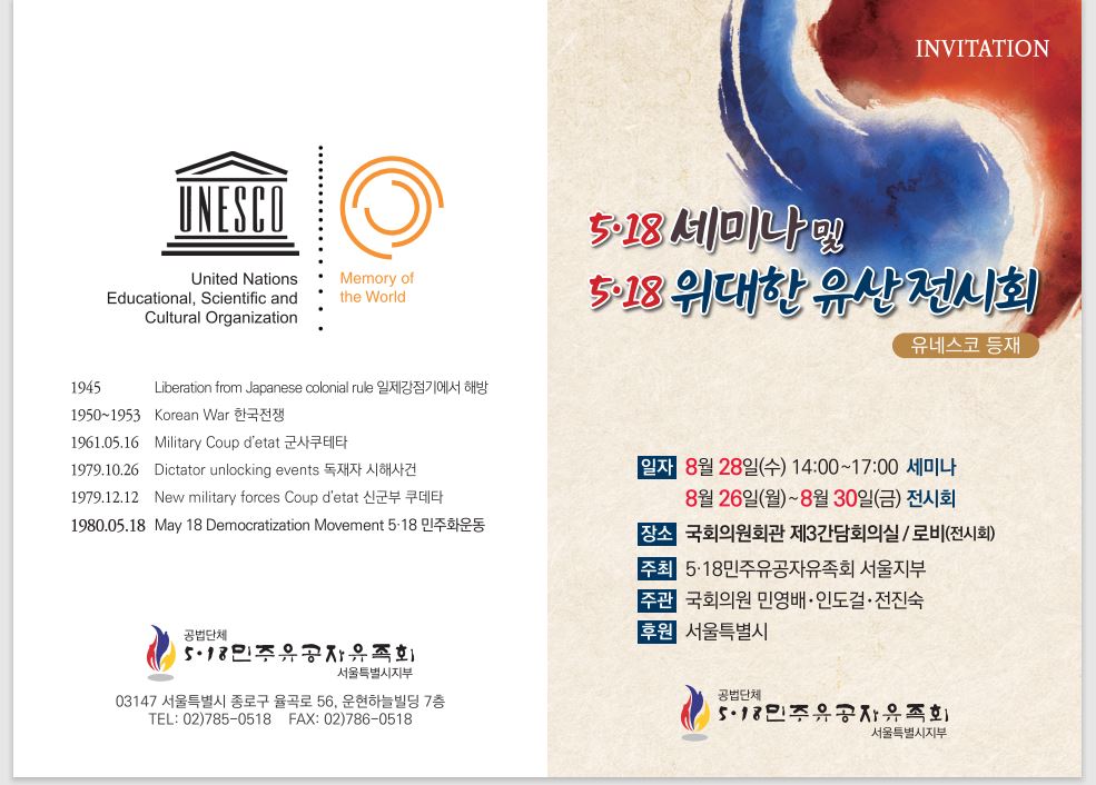 <5·18민주유공자유족회 서울특별시지부>가 국회의원회관에서 5·18기록물 유네스코 세계기록유산 등재 기념 기획전시와 '5·18을 넘어 대동사회로 가는 길'이라는 주제로 세미나를 8월 28일 각 개최합니다.