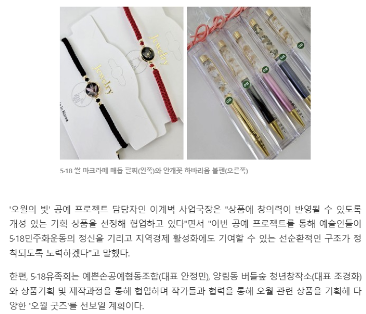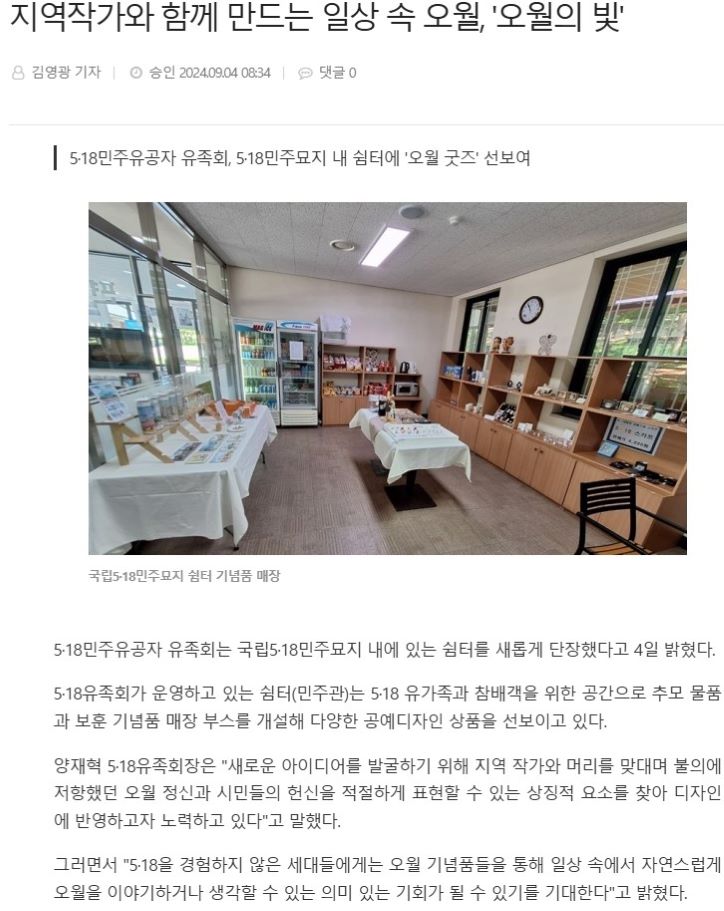 5·18민주유공자유족회가 국립5·18민주묘지 내 쉼터(민주관)를 새롭게 단장하고 오월 굿즈' 기념품을 판매합니다. 5·18 유가족분들과 참배객을 위한 공간으로 추모 물품과 보훈 기념품 매장 부스를 개설해 다양한 공예디자인 상품을 선보이고 있으니 많은 애정과 관심 부탁드립니다