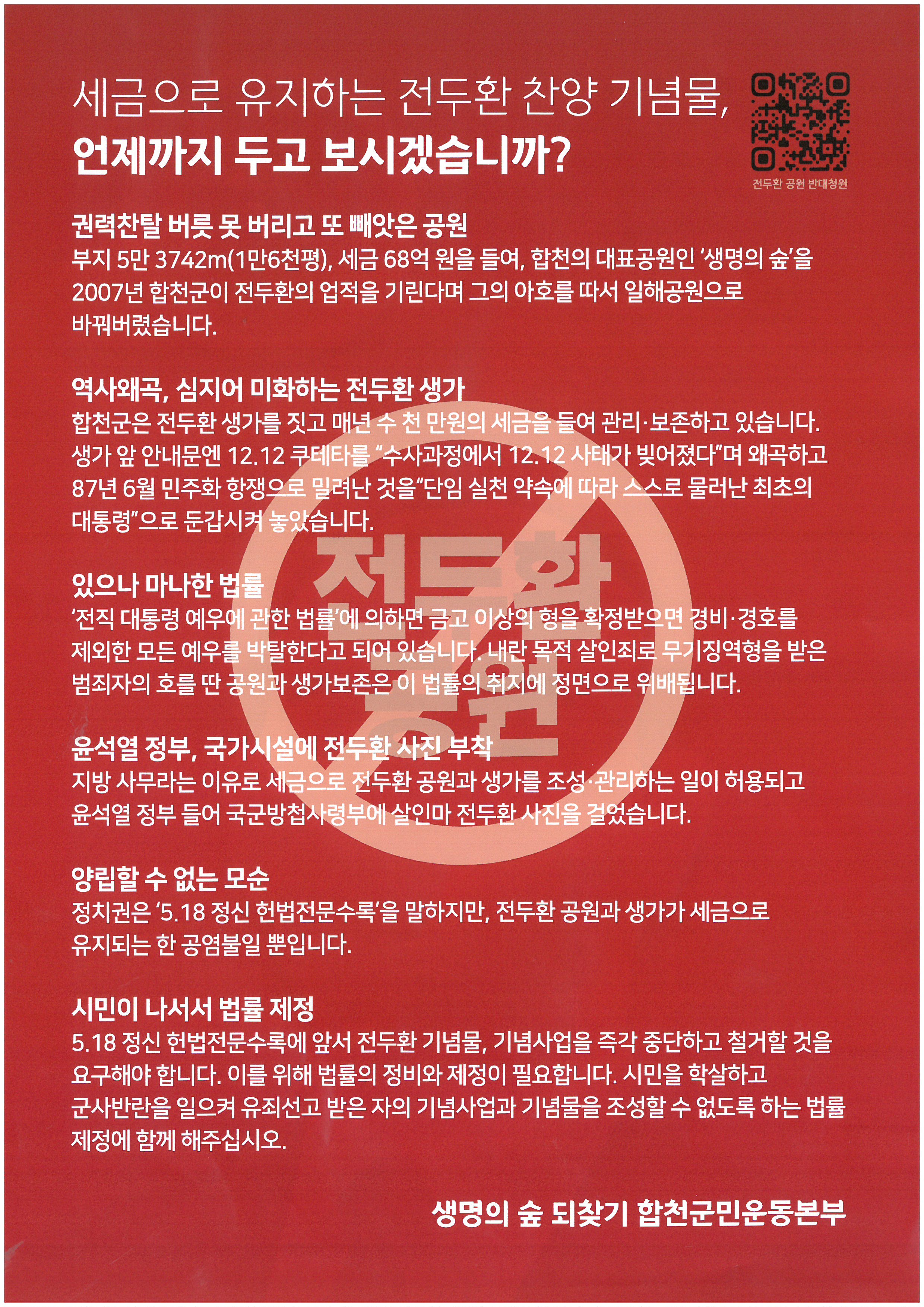 국민 여러분, 우리의 역사를 바로 세우고, 국민의 인권과 민주주의를 지키기 위해 일해공원 폐지와 전두환 기념물 조성 금지 법률 제정에 함께해 주십시오.