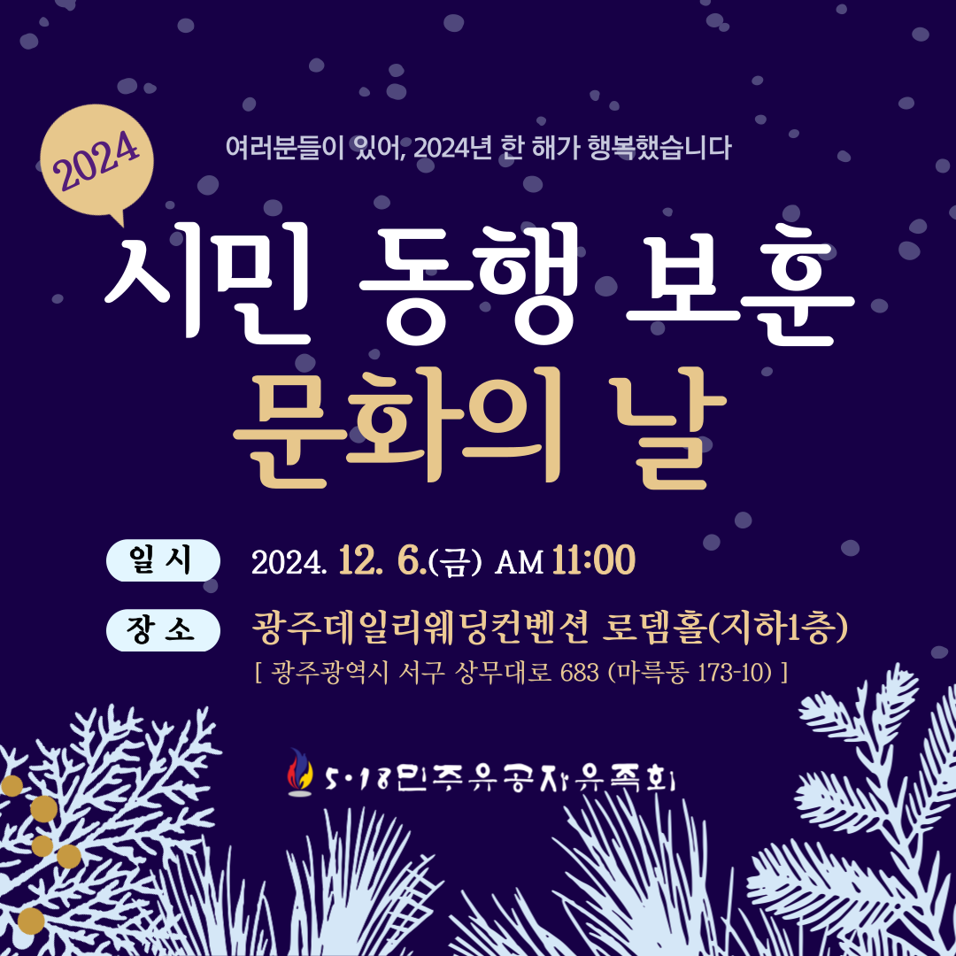 2024년 유족회에 보내주신 회원분들 및 각계각층의 시민분들에게 감사의 마음을 담아 모시는 자리를 마련하였습니다. 많은 회원분들 및 시민들의 참석 바랍니다.