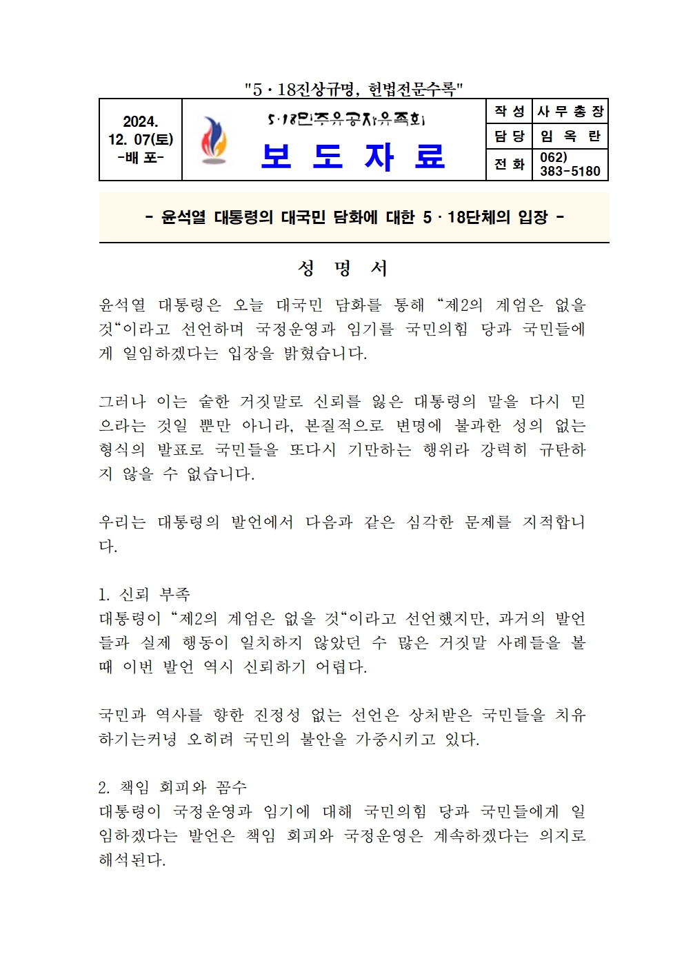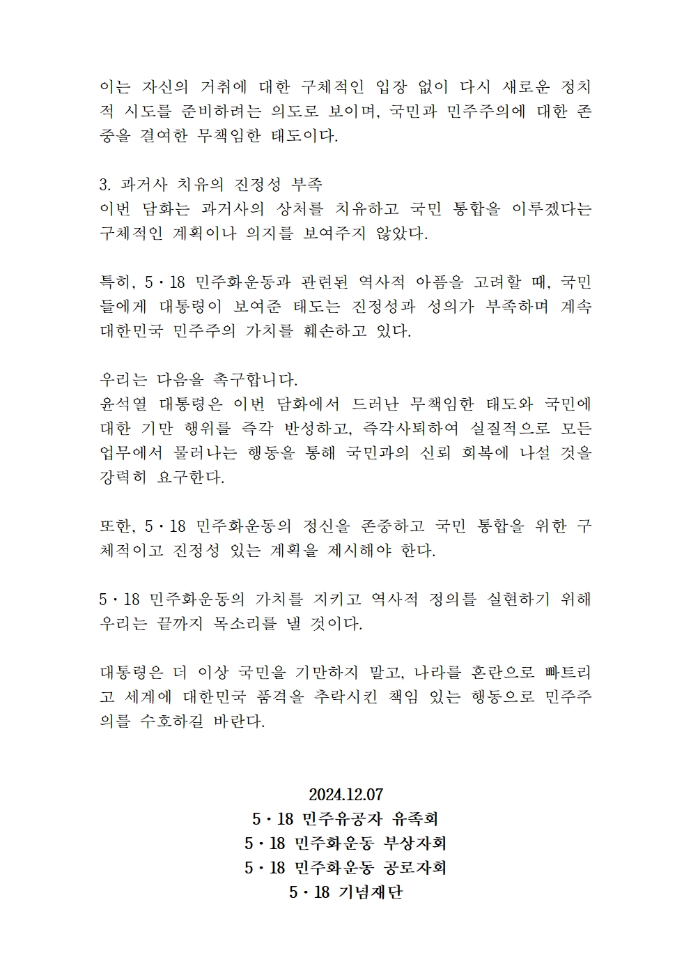 (성명서) 윤석열 대통령의 대국민 담화에 대한 5·18단체의 입장