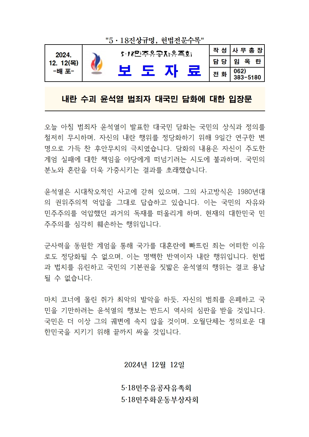12월 12일 윤석열 대통령 담화에 대한 오월단체 입장문