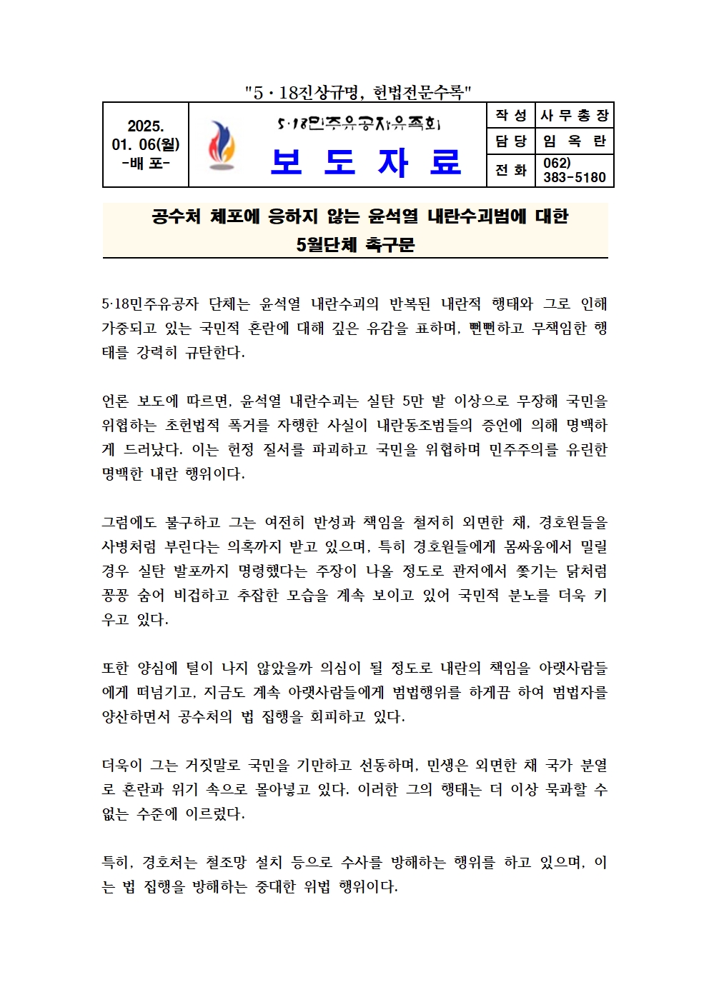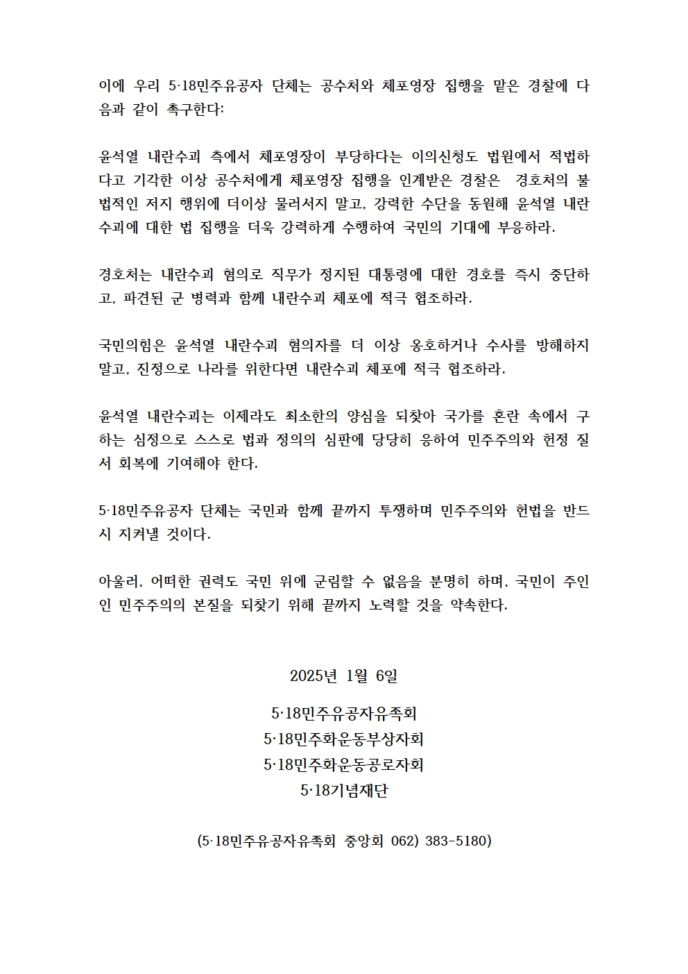 (5월단체 촉구문)공수처 체포에 응하지 않는 윤석열 내란수괴범을 규탄한다!