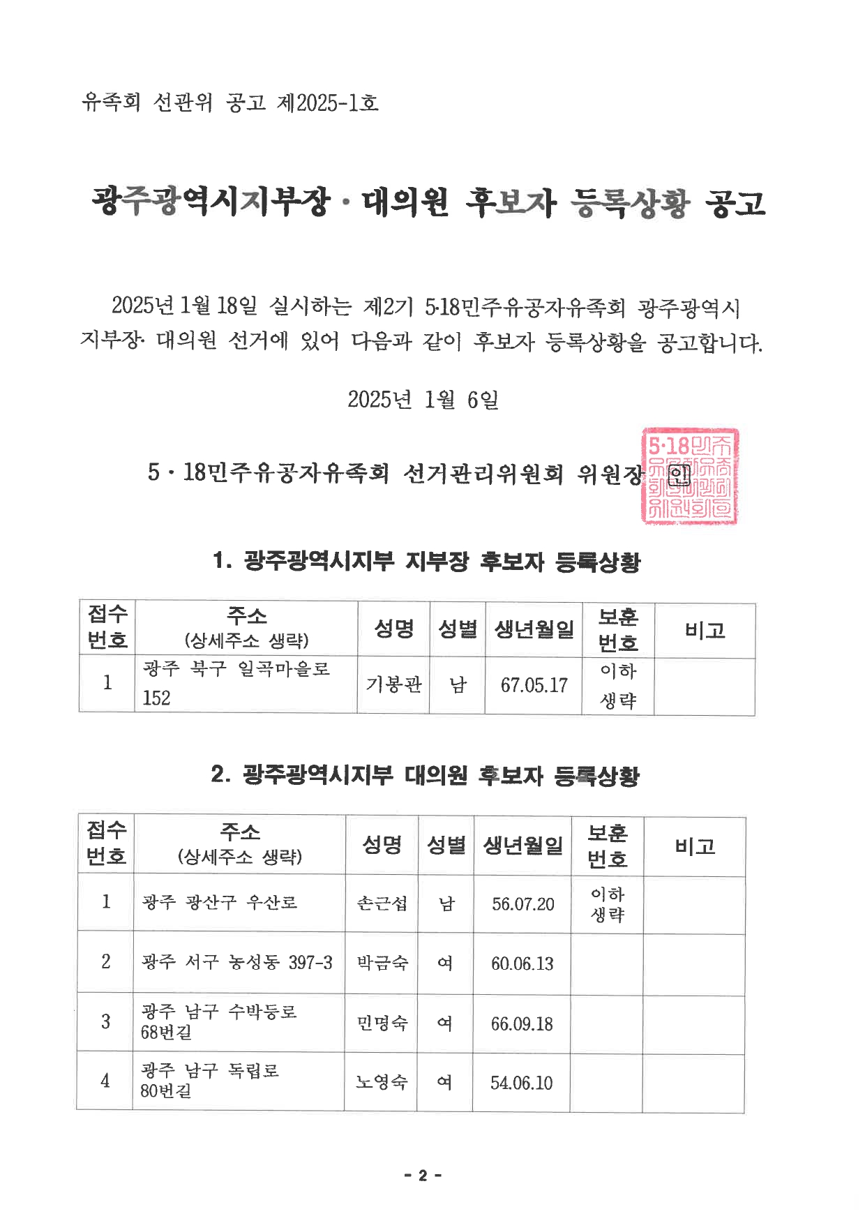 광주광역시지부 제2기 지부장·대의원 등록상황 공고(25.01.18 선거)