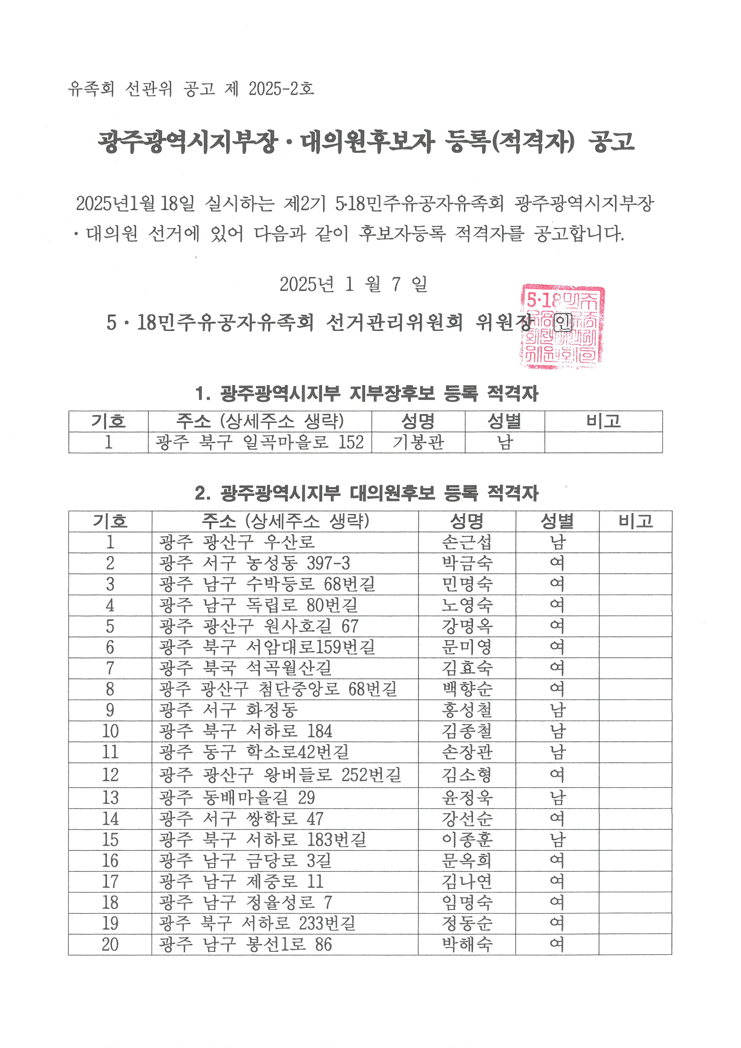 광주광역시지부 제2기 지부장·대의원 등록상황 공고(25.01.18 선거)