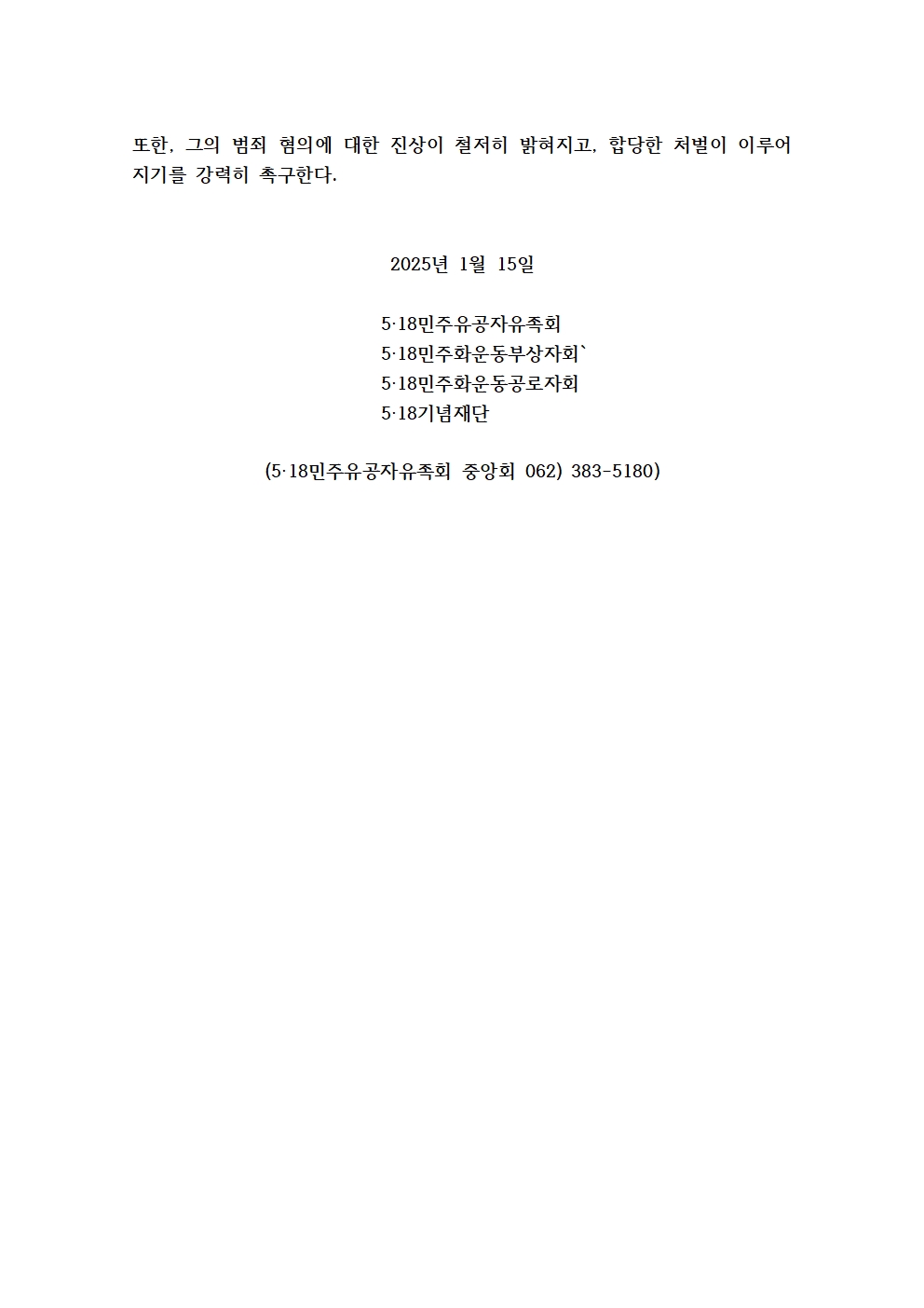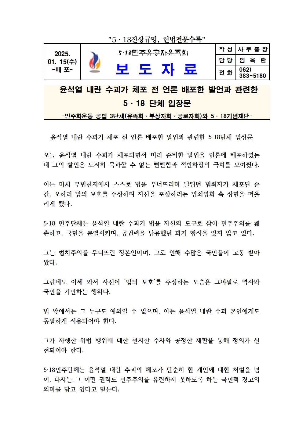 (4단체 입장문)윤석열 내란 수괴가 체포 전 언론 배포한 발언과 관련한 5·18 단체 입장문