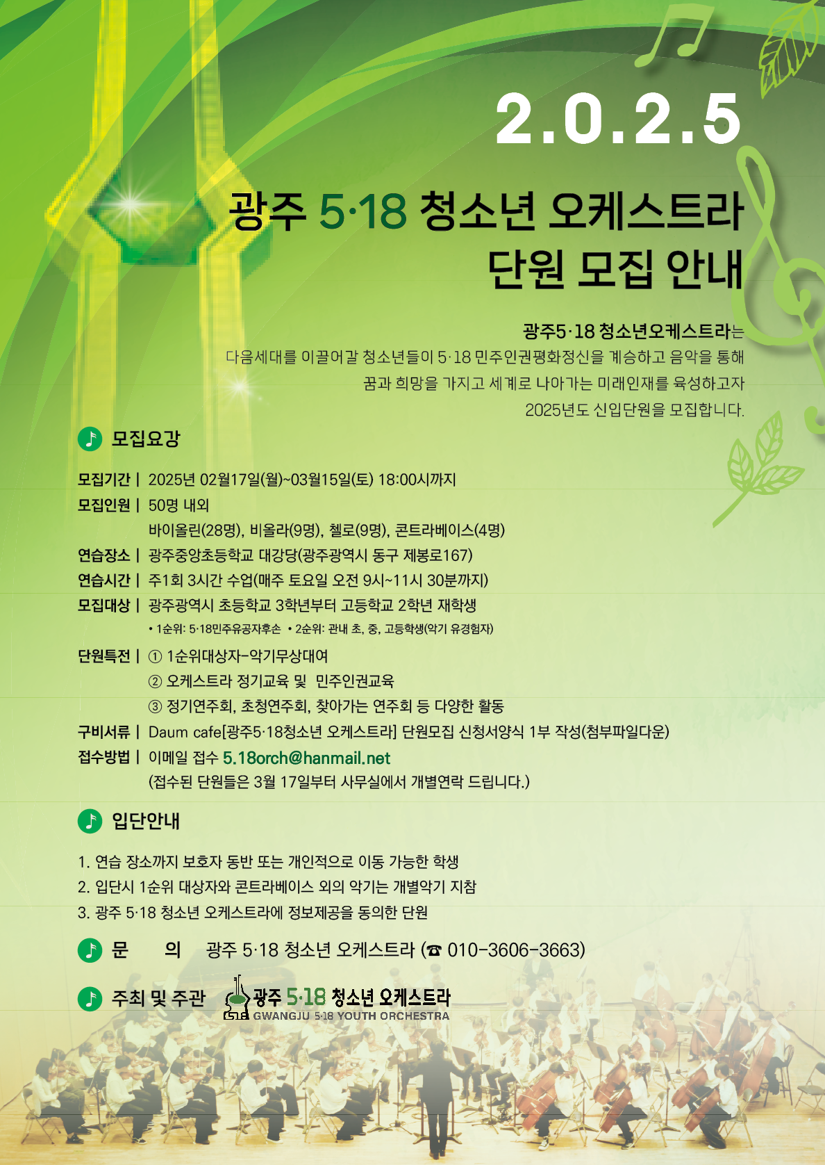 다음세대를 이끌어갈 청소년들이 5·18민주인권평화정신을 계승하고 음악을 통해 꿈과 희망을 가지고 세계로 나아가도록 미래인재를 육성하는 광주5·18청소년오케스트라에서 2025년도 신입단원을 모집합니다.