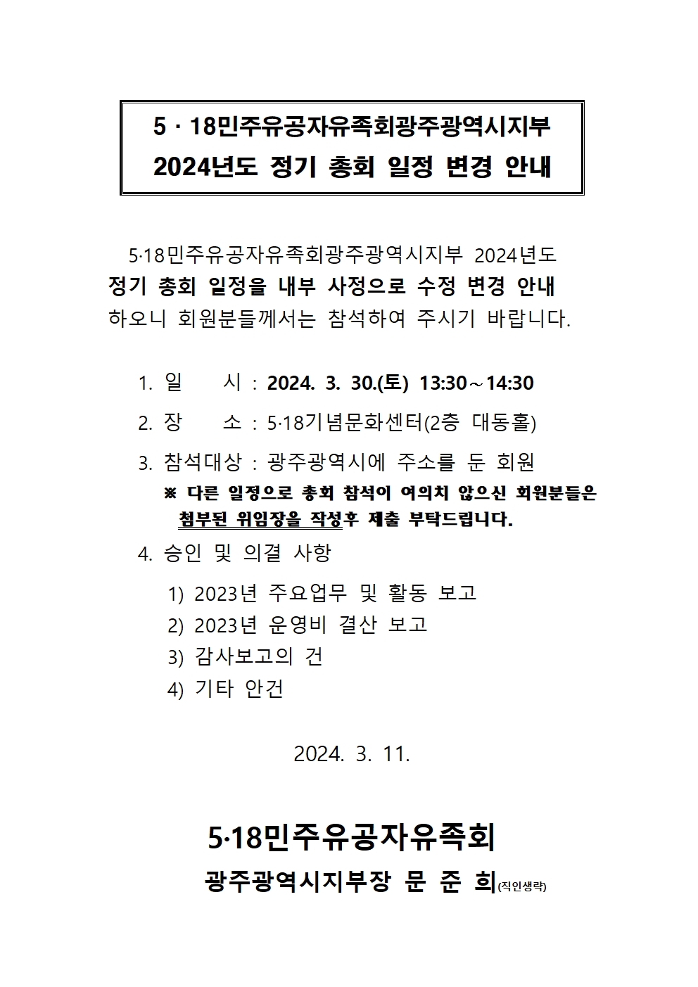 2024년도 광주광역시지부 정기총회 일정 변경안내